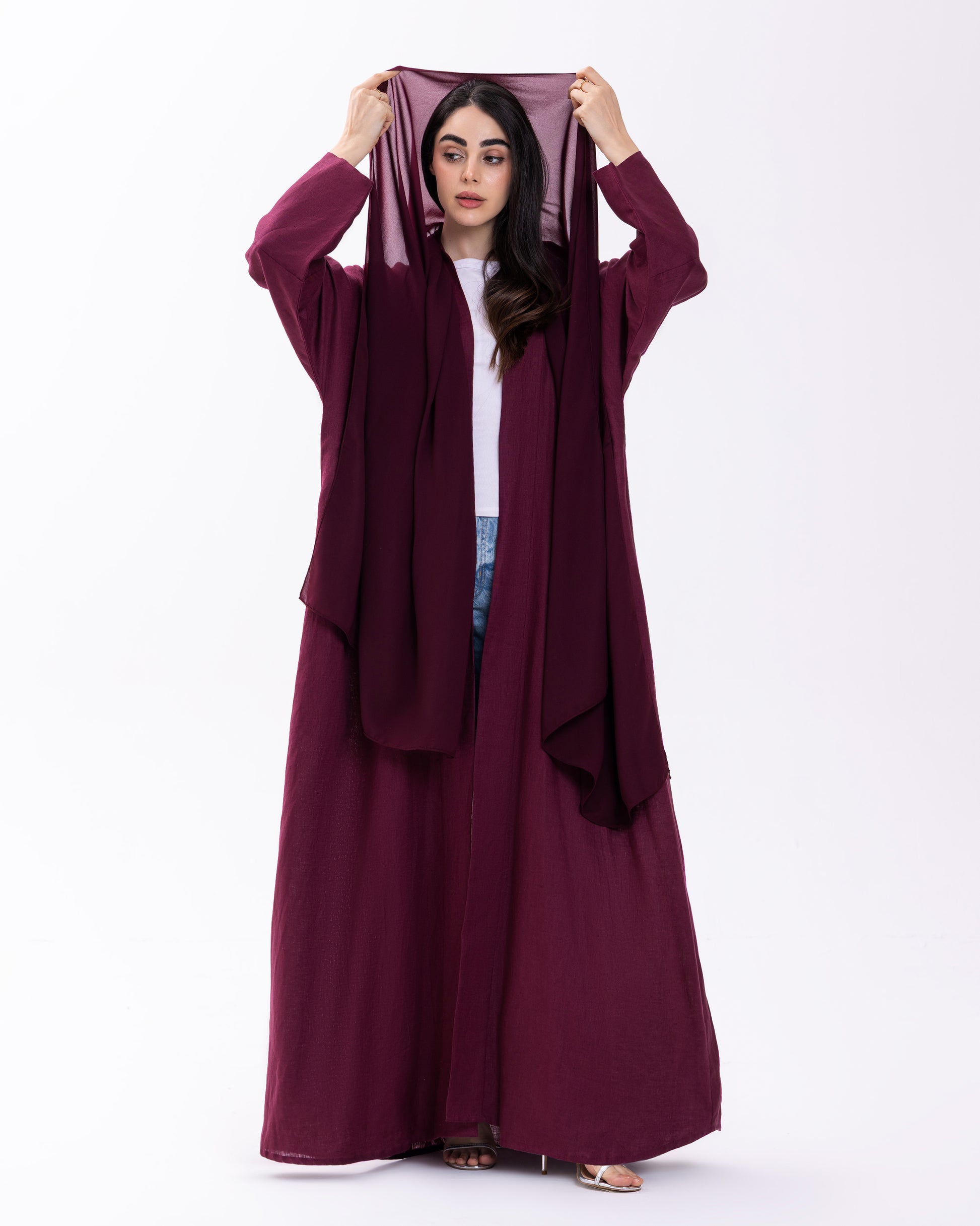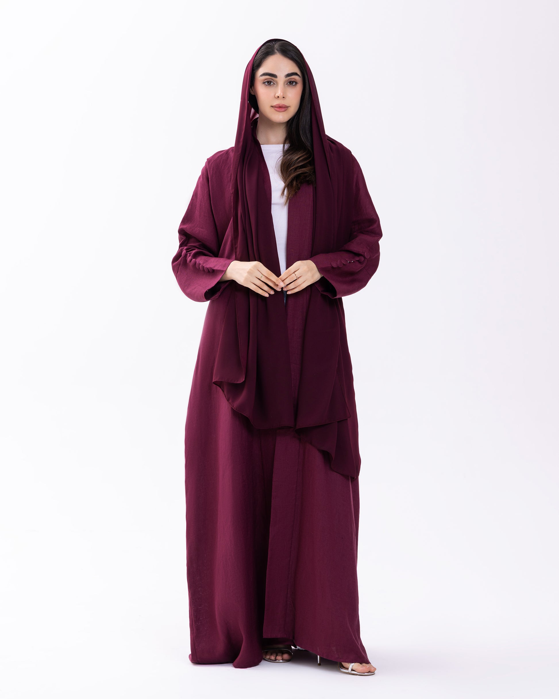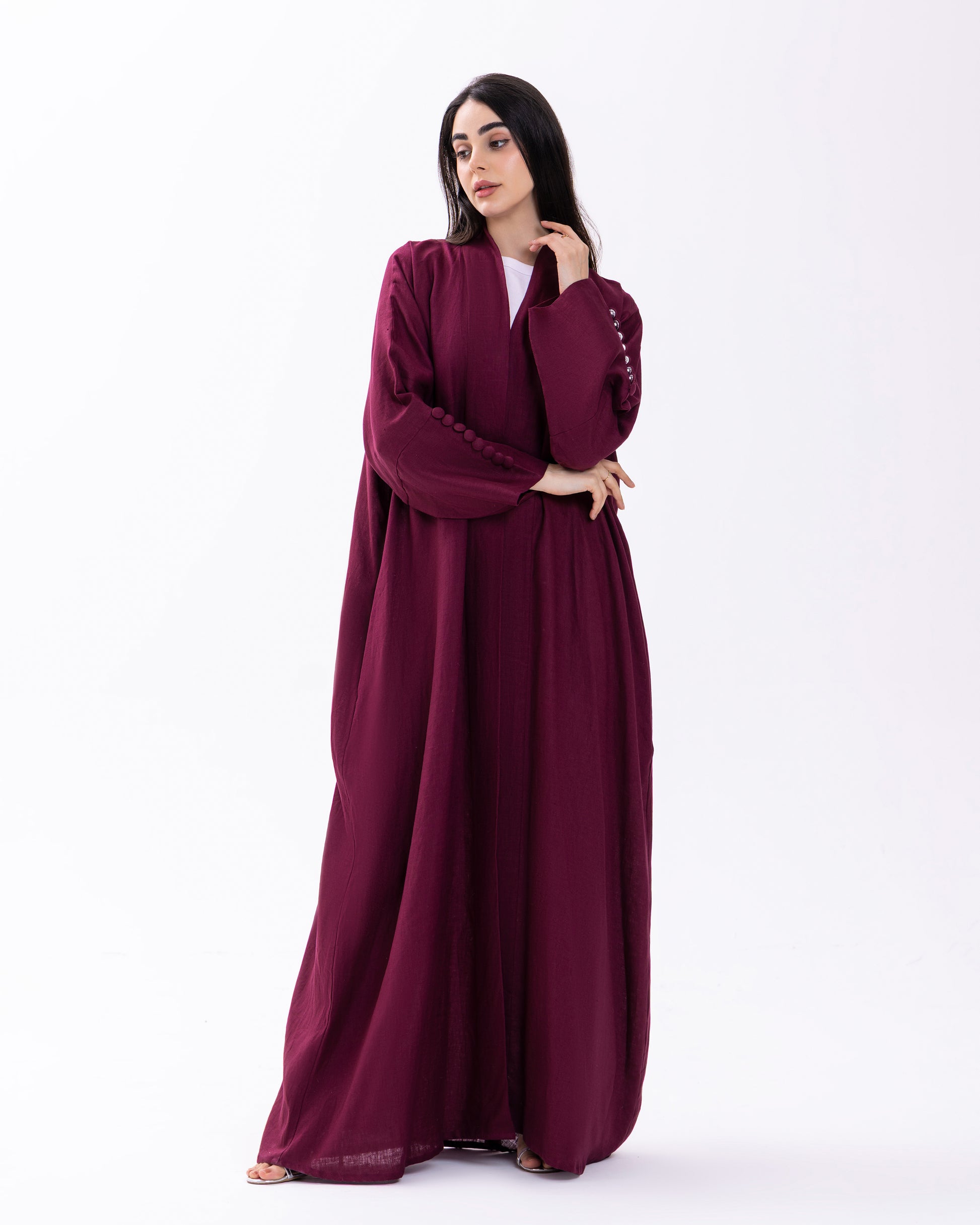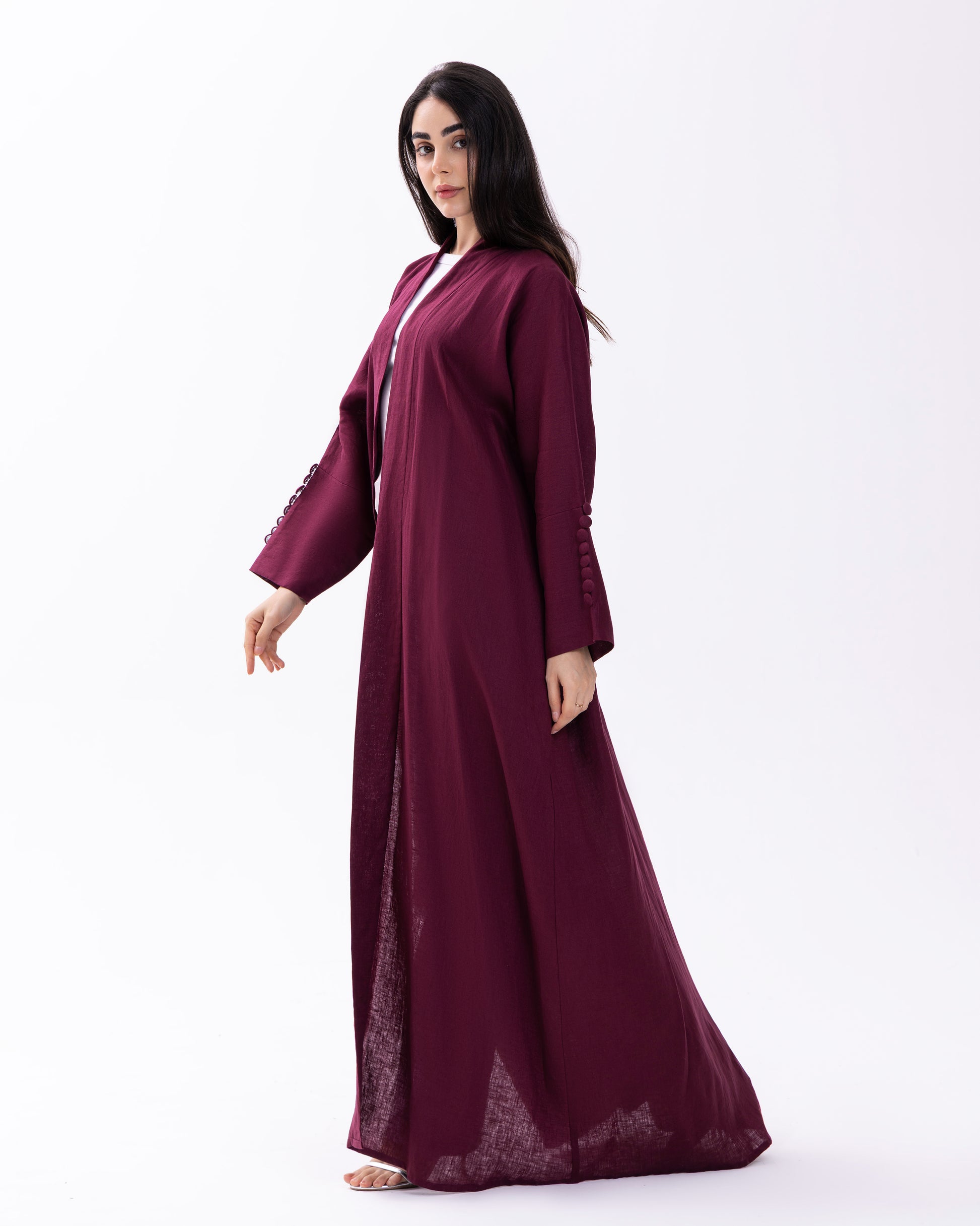 BURGUNDY BUTTONED CUFF ABAYA | PURE LINEN